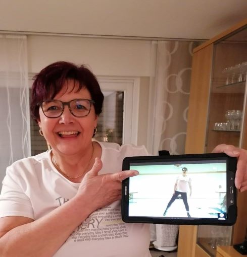 Dank unserer Zoom-Expertin Dagmar klappte fast alles problemlos. 30 (!) fitneßbegeisterte Damen waren von daheim „live“ mit dabei und kamen mit Angelika und Uli ordentlich ins Schwitzen.